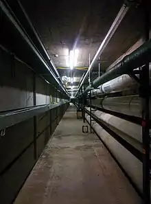 The existence of tunnels on campus has sparked the imagination of students since the early years of the university.[73] There are, of course, the tunnels that connect the residence buildings with the Dining Centre, as well as the multiple maintenance tunnels which provide central heating and water to every building on campus. However, the oldest of these tunnels is the one that connects the two oldest buildings on campus, Science A with Administration. Then called the Science and Engineering building and the Arts and Education building respectively, this tunnel provided students passage from the harsh prairie winters between 1960 and 1963. This tunnel usage was described by a 1961 editorial from the Gauntlet: "A tunnel between Arts-Education Building and the Science-Engineering Building does exist...but this tunnel more closely resembles a catacomb than a tunnel," only suitable for "troglodytes [who] never come out in the sun."[74] This tunnel however, also functioned as a central heating tunnel, carrying pipes containing pressurised water, hot steam, and electrical wiring. It was for this reason that they were closed by the Board of Governors, due to the potential hazards that the central heating pipes could have on transiting students.[75] Reactions from students were widely negative, and several attempts to re-open the tunnels continued well into the late 1960s. A 1963 Gauntlet editorial summarised the general student reaction: "The tunnel was closed closed to spare us the danger of being parboiled, and this shows a gratifying concern for our welfare. But I, for one, would prefer to die warm."[76] This tunnel still exists today. The tunnel empties its steam from surface vents that protrude the earth in front of the southwest door of Science A and the west doors of Administration. They can only be accessed from Rooms SA 01V, AD 10A, and AD 39V. This tunnel can be seen the Interactive Room Finder under Room SA 01Z.