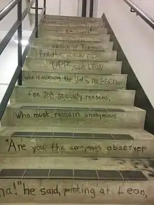 One of the most beloved features among arts students[73][93][94] is the saga known as "The Tale of Leon the Frog" which was originally written in the early 1970s on top of the stairwell in Social Sciences.[95] It chronicles the journey of a young frog named Leon and features overheard conversations of students from the time. Such existentialist musings from the 13-flights-of-stairs long poem include: