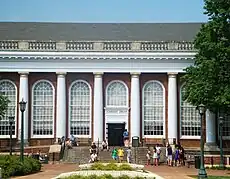 The University of Virginia Library System consists of a dozen libraries and holds over 5 million volumes. Its Electronic Text Center, established in 1992, has put 70,000 books online as well as 350,000 images that go with them. These e-texts are open to anyone and, as of 2002, were receiving 37,000 daily visits (compared to 6,000 daily visitors to the physical libraries).[89] Alderman Library holds the most extensive Tibetan collection in the world, and holds ten floors of book "stacks" of varying ages and historical value. The Albert and Shirley Small Special Collections Library features a collection of American literature as well as two copies of the original printing of the Declaration of Independence. It was in this library in 2006 that Robert Stilling, an English graduate student, discovered an unpublished Robert Frost poem from 1918.[90] Clark Hall is the library for SEAS (the engineering school), and one of its notable features is the Mural Room, decorated by two three-panel murals by Allyn Cox, depicting the Moral Law and the Civil Law. The murals were finished and set in place in 1934.[91] As of 2006, the university and Google were working on the digitization of selected collections from the library system.[92]