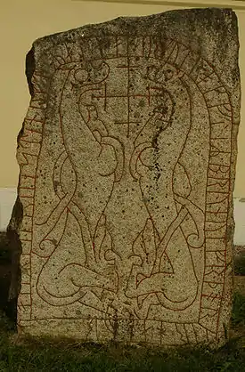 This inscription consists of runic text in the younger futhark surrounding two beasts and a Christian cross that is on a granite runestone which is 1.58 meters in height. It was known in the 17th century, and Olof Celsius is known to have inspected it in 1717 and 1726.[1] Richard Dybeck, known for authoring the lyrics of the Swedish national anthem Du gamla, Du fria, attempted to locate the runestone in 1863 but was told that it had been walled up in the church.[1] Before the historical nature of runestones was understood, they were often reused as materials in the construction of roads, bridges, and buildings. The stone was rediscovered during restoration of the church on September 27, 1965, under the threshold of the church porch and raised outside the church.[1]