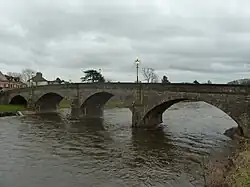 The existing stone bridge is constructed of Old Red Sandstone and is attributed to the Welsh bridge builder William Edwards. It was built between 1746 and 1747. It has five arches with pointed cutwaters between each arch.[1] The bridge was widened in 1836-7, the widening maintaining the original appearance.[1] The evidence of reconstruction can be seen in the arch soffits.[2]