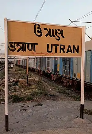 Utran railway station is a small railway station on the Western Railway network in the state of Gujarat, India.[1] It serves Utran town of Surat district. Utran railway station is 3 km (1.9 mi) from Surat railway station. Passenger and MEMU trains halt here.[2][3]