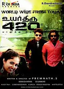 Uyarthiru 420 (transl. Respected 420) is a 2011 Tamil language action drama film directed by S. Premnath[1] The film stars lyricist Snehan, Vaseegaran, and Meghana Raj in the lead roles, while Akshara Gowda, Aishwarya Rajesh, and Akshaya play supporting roles. The film revolves around "an ordinary man who aspires to become rich by adopting wrong ways like hugging women by taking advantage of them and fondling their hip folds under the pretext of seeing them as sisters".[2] It was released on 12 August 2011.[3] The music was composed by Mani Sharma with cinematography by D. Shankar. The film was shot in Bangalore.[4] The film was released on 12 August 2011.