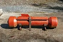 Ground-launched V-1s were propelled up an inclined launch ramp by an apparatus known as a Dampferzeuger ("steam generator"), in which steam was generated when hydrogen peroxide (T-Stoff) was mixed with sodium permanganate (Z-Stoff).[39][40] Designed by Hellmuth Walter Kommanditgesellschaft, the WR 2.3 Schlitzrohrschleuder consisted of a small gas generator trailer, where the T-Stoff and Z-Stoff combined, generating high-pressure steam that was fed into a tube within the launch rail box. A piston in the tube, connected underneath the missile, was propelled forward by the steam. It is a common misconception that the steam launch was to allow the engine to start running but the real reason was that the Argus had insufficient power to propel the V1 to a speed above its extremely high stall speed. The launch rail was 49 m (160 ft) long, consisting of 8 modular sections, each 6 m (20 ft) long, and a muzzle brake. Production of the Walter catapult began in January 1944.[41][42]