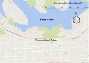 The Vancouver Downtown Historic Railway was a heritage electric railway line that operated from 1998 to 2011 between Granville Island and Science World (Olympic Village Station after 2009), in Vancouver, British Columbia, Canada. It operated only on weekends and holidays, usually from May to mid-October, and was aimed primarily at tourists. Two restored interurban trams were used on the line, which used a former freight railway right-of-way.