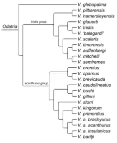 Vidal et al. 2012 separated Odatria into two species groups; the V. acanthurus group included V. acanthurus, V. baritji, V. brevicauda, V. bushi, V. caudolineatus, V. eremius, V. gilleni, V. kingorum, V. primordius, and V. storri, while the V. tristis group included V. auffenbergi, V. glauerti, V. glebopalma, V. mitchelli, V. pilbarensis, V. scalaris, V. semiremex, V. similis, V. timorensis, and V. tristis. [4]