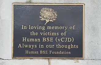 A memorial plaque for those who have died due to vCJD was installed in central London in approximately 2000.[71] It is located on the boundary wall of St Thomas' Hospital in Lambeth facing the Riverside Walk of Albert Embankment.[72]