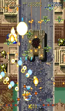 Varth's gameplay draws very heavily from 1942 and other games in Capcom's 194X series.[3] The goal is to destroy enemy units while avoiding being hit, and reach the end of the level, occasionally ending with a boss fight. There are 30 levels in the game. One hit from an enemy will cause the player to lose a plane. The biggest difference between Varth and most other games in the genre of its time is the inclusion of items called "Pods". When a player picks up a pod item, a pair of pods will follow the player and carry weaponry of their own to supplement their artillery. Additionally, pods can completely block most (but not all) forms of attacks from enemies, rendering the player almost invulnerable to attack from any direction in which the pods are situated. Players can choose from two formations for their pods - fixed or smart. In fixed mode, both pods remain directly in front of the player to render the planes invulnerable from the front, but leave them open on the sides and from behind. In the smart position the pods will remain separate from each other at a 180-degree angle, and move about according to the direction of incoming fire. If enemy fire manages to slip between the pods before they can react (potentially common in later levels as large numbers of enemies appear on screen), the player is left vulnerable and only has the option of moving in hopes of avoiding a hit.
