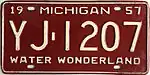 1957 White on red; "19 MICHIGAN 57" at top Water Wonderland AB-1234 County-coded Front and rear plates issued (as from 1910–43); this practice continued until 1981.