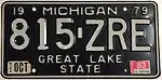 1979–82 Embossed reflective (glass-beaded) white serial on black plate with border line; "19 MICHIGAN 79" at top. "GREAT LAKE STATE" centered at bottom ABC-123 BBB-000 to ZZZ-999 Serials BBB-000 through NVM-999 were issued by county.[4][7] Front and rear plates issued until April 1, 1981; only rear plates have been issued ever since.