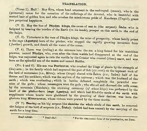 The inscription begins with a Sanskrit portion that invokes the God Shiva, and describes the mythical lineage of the Pandya kings, naming the sage Agastya as their family priest. It also gives the following account of the dynasty's origin:[11]