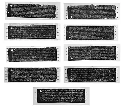 H. Krishna Sastri, who first edited and translated the inscription, suggested that the Sanskrit part may have been added later to give the inscription a "dignified appearance".[8][10] However, this is unlikely, because similar Sanskrit portions also appear in other near-contemporary Pandya inscriptions. Moreover, the Tamil text of the Velvikudi inscription does not start on a new copper plate, but in the middle of the reverse of the third copper plate. The Sanskrit text that appears at the end of the inscription begins on the reverse of the ninth copper plate, but it is followed by Tamil text starting in the middle of the last copper plate.[8]
