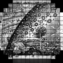 The camera focal plane is flat and 64 cm in diameter. The main imaging is performed by a mosaic of 189 CCD detectors, each with 16 megapixels.[45] They are grouped into a 5×5 grid of "rafts", where the central 21 rafts contain 3×3 imaging sensors, while the four corner rafts contain only three CCDs each, for guiding and focus control. The CCDs provide better than 0.2 arcsecond sampling, and will be cooled to approximately −100 °C (173 K) to help reduce noise.[46]