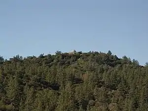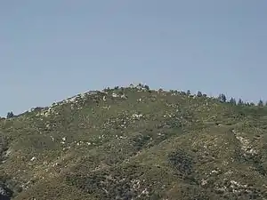 ![]() The northern face of Vetter Mountain as viewed from Angeles Crest Highway from the Chilao area. The Vetter Mountain fire lookout tower is at the summit. |