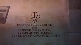 The victor symbol (Spanish: víctor or vítor) is an emblem that is painted on the walls of some Spanish and Latin American universities to commemorate students who have received the degree of doctorate. The custom dates back to the 14th century, and the symbol has historically been used at older universities in the Spanish-speaking world, such as the University of Salamanca,[1] the University of Alcalá, and the University of Seville[2] in Spain, as well as the National University of San Marcos in Lima, Peru.[3] According to the custom, when a student receives the doctorate, the victor symbol is painted on the walls of the university in red or black paint along with the student's name.