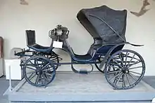 The victoria has a low body with a forward-facing seat for two passengers under a retractable calash top and a raised driver's seat on an iron frame.[3] In the panel-boot type of victoria, sometimes confusingly called a cabriolet,[2] a box under the driver's seat provides storage, a "boot", and forms a dashboard.[3] In a Grand Victoria, a collapsible backwards-facing seat behind the driver accommodates additional passengers; the Victoria-Hansom was a later form of hansom cab based on the victoria.[2]