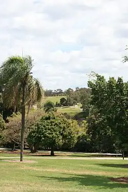 Victoria Park occupies undulating land which generally falls steeply from the ridge at Gregory Terrace down to the railway line, across the railway line, north to Gilchrist Avenue. The ridge offers expansive views across to the Old Museum, RNA Showgrounds (Brisbane Exhibition Ground), Royal Brisbane Hospital, University of Queensland Mayne Medical School, Victoria Park Golf Course, Red Hill, Mt Coot-tha and across to the Brisbane CBD and beyond.[3]
