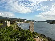 A local Galician legend also claims that when the Vikings arrived at the mouth of the river Masma, in northern Galicia, Gonzalo, the holy Bishop of the local diocese of Britonia, from atop of a hill prayed for protection from the heavens against the forthcoming attack: a major storm was unleashed, sinking most of the flotilla but a ship that could flee to warn the rest of the fleet.[27][28] A series of early medieval rock castles placed atop hills and mountains with large visual field over the ocean, extending along the coasts of Galicia, have been tentatively identified as temporary shelters and watchtowers built by local communities or lords against Norse raids.[29]