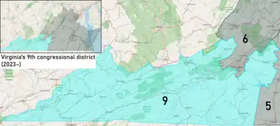 Virginia's ninth congressional district is a United States congressional district in the Commonwealth of Virginia, covering much of the southwestern part of the state. The 9th is Virginia's second-largest district in area, covering 9,113.87[4][5] square miles (slightly larger than the whole state of New Jersey). It has been represented by Republican Morgan Griffith since 2011. He took office after defeating 14-term incumbent Democrat Rick Boucher.[6] With a Cook Partisan Voting Index rating of R+23, it is the most Republican district in Virginia.[3]