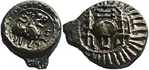 ![]() Vishnukundina Empire, 420–674 AD, cast copper, 4.65g, Vidarbha (Maharashtra), Bull type. | |||||||||||