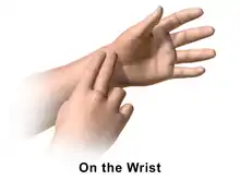 The pulse is the rate at which the heart beats while pumping blood through the arteries, recorded as beats per minute (bpm).[13] It may also be called "heart rate". In addition to providing the heart rate, the pulse should also be evaluated for strength and obvious rhythm abnormalities.[13] The pulse is commonly taken at the wrist (radial artery). Alternative sites include the elbow (brachial artery), the neck (carotid artery), behind the knee (popliteal artery), or in the foot (dorsalis pedis or posterior tibial arteries).[13] The pulse is taken with the index finger and middle finger by pushing with firm yet gentle pressure at the locations described above, and counting the beats felt per 60 seconds (or per 30 seconds and multiplying by two).[13] The pulse rate can also be measured by listening directly to the heartbeat using a stethoscope. The pulse may vary due to exercise, fitness level, disease, emotions, and medications.[13] The pulse also varies with age. A newborn can have a heart rate of 100–160 bpm, an infant (0–5 months old) a heart rate of 90–150 bpm, and a toddler (6–12 months old) a heart rate of 80–140 bpm.[14] A child aged 1–3 years old can have a heart rate of 80–130 bpm, a child aged 3–5 years old a heart rate of 80–120 bpm, an older child (age of 6–10) a heart rate of 70–110 bpm, and an adolescent (age 11–14) a heart rate of 60–105 bpm.[14] An adult (age 15+) can have a heart rate of 60–100 bpm.[14]