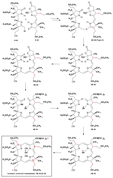 - ↑ See Synthesis of dicyano-cobalt(III)-5,15-bisnor-a,b,d,e,g-pentamethyl-cobyrinate-c-N,N-dimethylamide-f-nitrile (the common corrinoid intermediate) from the ring-D-differentiated A-D-component in (Show/Hide) "Coupling of Harvard A-D-components with the ETH B-C-component".