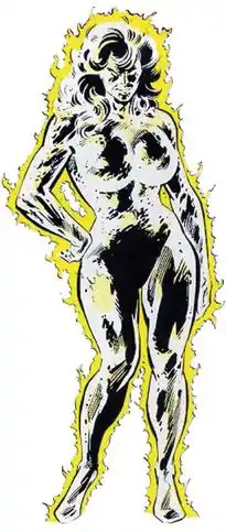 Later, she was briefly reunited with a de-powered Molecule Man (who had mysteriously returned to Earth) and battled Klaw. It was at that time that she gained the ability to assume volcanic rock and volcanic ash forms. She subsequently discovered that, just before his supposed "death," Molecule Man had secretly "willed" her a portion of his reality-warping power, and it was this power that gave her the ability to manifest these other forms at critical times, just when she needed them. Once he regained his power from her, she found herself no longer able to tolerate the darker side of his personality. She terminated their relationship, although Molecule Man vowed to one day prove his full love to her.[13]
