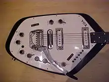 Vox experimented with several built-in effects and electronics on guitars such as the Cheetah, Ultrasonic, and Invader. Ian Curtis of Joy Division is known to have owned two white Vox Phantom VI Special effects guitars which had push button switches on the scratch plate to activate the effects circuits. Another innovation was the Guitar Organ, which featured miniaturised VOX organ circuitry activated by the contact of the strings on the frets, producing organ tones in key[2] with guitar notes in one of three ways. A switch on the instrument allow choosing between guitar only, organ only (holding down strings produced an organ tone without the string needing to be played in a traditional sense as mentioned) and a combination of both. This instrument was heavy and cumbersome with a steel neck and external circuit boxes. The initial production run proved unreliable due to the fact that JMI production engineers, eager to put the instrument into production, had used Denney's prototype as a template for wiring the instrument in Denney's absence. As a consequence, the instrument gained a negative reputation, but was a hallmark of the ingenuity of the company.[2]