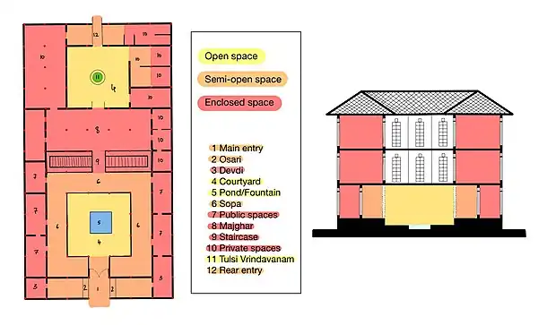 Wada houses typically have an introverted blueprint with a courtyard at its core. Several wada houses formed residential clusters called peth in Pune or pol in Ahmedabad or mohalla in north India. These clusters enclosed within a perimeter wall would have sufficient wells (for drinking water), worship and chowk within them.[1] Just like a house has a chowk (courtyard), mirrored at the cluster level is also a chowk within a group of smaller wadas which are spaces for social activities in the community. These spaces don not have a particular function, most activities just spilled out here. It is this outdoor usage of space, from a climatological and social point of view, that necessitated the courtyard getting formally integrated into the built form.[1] The chowk of the village usually has a tree with a low platform (paar) around it. This facilitated the coglomeration of people for relegious congregation and an open air sit out.[1]