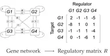 Network representation of the regulatory interactions between four genes (G1, G2, G3 and G4). Activations and repressions are denoted by arrows and bars, respectively. Numbers indicate the relative interaction strengths. Interaction matrix on the right representing the network on the left.