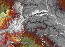 The Wakhan Corridor (Pashto: واخان دهلېز, romanized: Vâxân dahléz, Persian: دالان واخان, romanized: dâlân-e vâxân) is a narrow strip of territory located within the Badakhshan province of Afghanistan. This corridor stretches eastward, connecting Afghanistan to Xinjiang, China. It also separates the Gorno-Badakhshan Autonomous Region of Tajikistan in the north from northern Pakistan in the south.[1][2][3][4][5] This high mountain valley serves as the source of both the Panj and Pamir rivers, which converge to form the larger Amu River. For countless centuries, a vital trade route has traversed this valley, facilitating the movement of travelers to and from East, South, and Central Asia.[6]