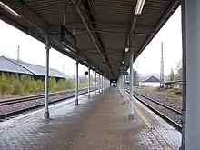 Waldheim station was opened in 1852 when the line between Limmritz and Chemnitz, the last section of the Riesa–Chemnitz railway, was opened. Despite the fact that two branch lines — the Waldheim–Rochlitz railway and the Waldheim–Kriebethal railway which was opened 1896 - joined the mainline here, the track plan of this junction station remained comparatively simple. In the last years of the line there was only one track with a run-around loop for the locomotives of the Rochlitz trains. They used the island platform which at this time had remained the only platform in the station (a second platform without a canopy had been removed when the mainline was re-doubled and electrified). The opposite side of the island platform was and still is used by the mainline trains between Riesa and Chemnitz. With the building work progressing, the Rochlitz track was joined to the mainline, too, but is hardly used any more. The station building had stood empty and suffered from increasing decay for several years until most of it was demolished in 2015, leaving only the porticus.[22][23] The long goods shed and the engine shed that was accessible via a turntable are also abandoned and decaying. The engine shed used to house locomotives for shunting duties and for the freight services to the paper mills in the Zschopau valley. Some team tracks have remained in use for a few years after closure of the WR line,[24][18] but now (2016) only a passing loop and two crossovers between the mainline tracks are left beside the latter.[25]