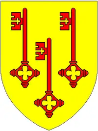 According to Sir William Pole (d.1635), the male line of the Clavell family was extinguished during the reign of King Richard II (1377-1399).[12] The heir to Lomen Clavell was the Beare family, lords of the nearby manor of Huntsham.[13] There was however at some time a dispute over the inheritance between Thomas Beare and Sir Henry Perchey (alias Percehay).[14] The hamlets of Lomen Clavell and Bukinton Clavell still retained the family's name in the 19th century.[15] According to Pole the arms of "Clavill of Burlescombe" were: Or, three keys gules[16] which are thus canting arms alluding to the Latin clavis, meaning a "key".