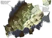 Additionally, some methods allow for "fencing ridgelines" and burning in flow pathways through lakes.[18] Some methods also enforce a small slope onto flat areas so that flow will continue to move toward the outlet.[19] The step of "burning in" stream channels involves artificially deepening the channel, by subtracting a large elevation value from pixels that represent the channel. This ensures that once flow has entered the channel, it will stay there rather than jumping out and flowing overland or into another channel. Some algorithms infer the location of channels automatically from the DEM. Better results are usually obtained by burning in mapped stream channels, or channels derived from satellite or aerial imagery.[20]