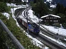 The Wengernalp Railway (German: Wengernalpbahn, WAB) is a 19.11 kilometres (11.87 mi) long rack railway line in Switzerland. It runs from Lauterbrunnen to Grindelwald via Wengen and Kleine Scheidegg, making it the world's longest continuous rack and pinion railway.[1] The name refers to the alpine meadow of Wengernalp, above Wengen.