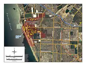 The West Montalvo Oil Field is a large and productive oil field on the coast of Ventura County, California, in the United States, in and adjacent to the city of Oxnard, California. Discovered in 1947,[1] it has produced approximately 43.7 million barrels (6,950,000 m3) of oil, and retains about 2.2 million barrels recoverable with current technology, in both the onshore and offshore areas. The offshore portion of the field is exploited from wells directionally drilled from onshore near McGrath Lake, from within an enclosure above the high-tide line at McGrath State Beach.
