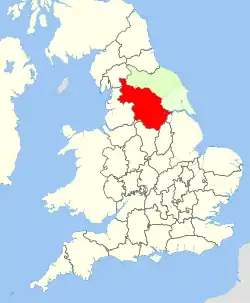 The West Riding of Yorkshire was one of three historic subdivisions of Yorkshire, England. From 1889 to 1974 the riding was an administrative county named County of York, West Riding. The lieutenancy at that time included the city of York and as such was named "West Riding of the County of York and the County of the City of York".[2] The riding ceased to be used for administrative purposes in 1974, when England's local government was reformed.
