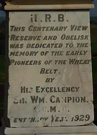 A celebration committee began preparations in 1928, and in 1929 produced a number of publications including calendars of events.[5] As 1929 approached, most towns formed their own committees and organised events, these ranged from special race meetings to regional shows, formal dinners, dances and sporting events. Additionally some towns and community organisations also renamed existing local features like parks and buildings, while others set aside an area for a monument which was then unveiled in the presence of dignitaries including the Governor, Premier and descendants of the early settlers.