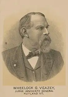 Colonel Veazey was active in the Grand Army of the Republic, serving as post commander of the Rutland post, then as Department Commander for the Vermont G.A.R. from 1873 to 1875. In 1877 and 1888, he served as Judge Advocate General on the staff of the Commander-in-Chief of the G.A.R., and finally as Commander-in-Chief himself from 1890 to 1891.[2] He was also a member of the Military Order of the Loyal Legion of the United States. In addition, Veazey was active in the Reunion Society of Vermont Officers, and served as its president from 1874 to 1875.
