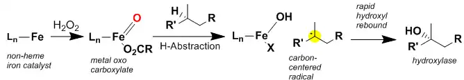 - ↑ Chen,K (2001). "Stereospecific alkane hydroxylation by non-heme iron catalysts: mechanistic evidence for an Fe=O active species". J. Am. Chem. Soc. 123 (26): 6327–6337. doi:10.1021/ja010310x. PMID 11427057.