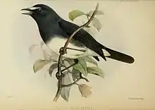 In 1867, W T Blanford described a new species Callene albiventris obtained by Rev. S. Fairbank from the Palni Hills. Blanford noted the similarity to the Nilgiri form while also noting the geographical isolation of the two forms and relation to species from northeastern India.[7] Eugene Oates in the first edition of The Fauna of British India moved the species back into the genus Brachypteryx stating that they were congeneric with Brachypteryx cruralis while also noting that the young birds were speckled as in true-thrushes like Callene (as represented by the Blue-fronted Robin). Oates also used the name "White-bellied Short-wing".[5] This genus placement was carried on in the second edition of The Fauna of British India (1924) by E. C. Stuart Baker[8] but was demoted into a subspecies on the basis of a specimen collected by T. F. Bourdillon at Mynal which was claimed to be intermediate to the two forms. Claud Buchanan Ticehurst in 1939 reaffirmed the genus placement.[9] This treatment as subspecies was carried forward by Salim Ali and Sidney Dillon Ripley in their "Handbook"[10][11] until the old two species were restored by P C Rasmussen in 2005.[12] In the Birds of South Asia (2005), however they moved the species tentatively into the genus Myiomela based on morphological similarities and pointed out that the placement in Brachypteryx was in error.[3] In 2010, DNA sequence studies suggested an ancient divergence in these two populations and confirmed their elevation to full species.[13] Another 2010 molecular phylogenetics study suggested that the genus Brachypteryx (the taxa sampled however, did not include the peninsular Indian forms) which was earlier thought to belong to the thrush family Turdidae belonged to the Old World flycatcher family Muscicapidae.[14] The type species of Brachypteryx, B. montana, shows strong sexual dimorphism.[15] The genus position was however not settled until 2017 and it was found based on a larger sampling that the species from southern India formed a group that is sister to the flycatchers in the genera Eumyias, Cyanoptila, Niltava, Cyornis and Anthipes. This led to the erection of the new genus Sholicola.[16][17]