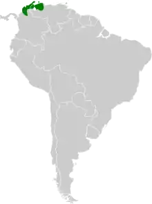 The nominate subspecies of the white-whiskered spinetail is found in northern Colombia's Sucre and Magdalena departments. Subspecies S. c. atrigularis is found in the middle reaches of the Magdalena River valley in northern Colombia. S. c. venezuelensis is found in far northern Colombia's Cesar and La Guajira departments and east into northwestern Venezuela as far as Falcón and Lara states.[7]