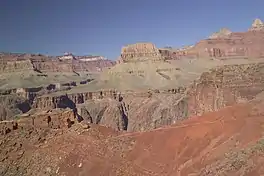 ![]() Widforss Point, with white Coconino Sandstone Kaibab Plateau, south flank upper left of Sumner Butte, at Granite Gorge (from South Kaibab Trail, on Tonto Platform) | |