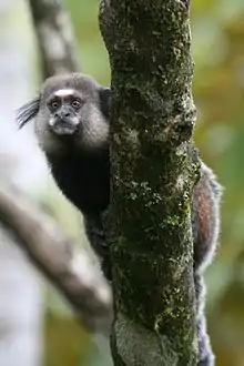 Wied's marmoset (Callithrix kuhlii), also known as Wied's black-tufted-ear marmoset, is a New World monkey that lives in tropical and subtropical forests of eastern Brazil. Unlike other marmosets, Wied's marmoset lives in groups consisting of 4 or 5 females and 2 or 3 males (plus children). They are matriarchal, and only the dominant female is allowed to mate. Like other marmosets, the offspring are always born in pairs.