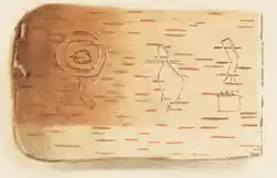 The Ojibwa peoples of the Great Lakes region historically used birch bark to keep records for instructional and guidance purposes.[5] Songs and healing recipes were readable by members of the tribe. Either through engraving or with the use of red and blue pigment, scrolls could contain any number of pictorial representations. Birch bark scrolls could measure anywhere from centimeters to several meters.[6]