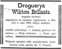- ↑ "Galicja i jej Aptekarze Wiktor Brillant Pharmacy in Jaroslaw a Research about pre WW2 pharmacies in Polish" (PDF). Podkarpacka Okr´gowa Izba Aptekarskaw Rzeszowie dr n. farm. Aleksander Czarniawy in Polish. 2010. Retrieved May 30, 2011.