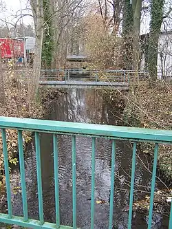 The Ratsrinne originates in the southwest of Gotha, immediately southwest of the district Sundhausen, at the former railway line, near the aqueduct of the Leina Canal. From here the brook first flows 5.3 km[1] in east-north-eastern direction and drains a catchment area of about 20 km² via mainly right tributary brooks, until in the eastern south of the town centre the Flachsröste (Töpfleber Graben), which is only 2.5 km long but drains a good 10 km², flows to it from the southeast. From here the actual Wild Rift begins, which from now on turns canalized to the north and finally to the northwest and still in the core city area takes up the Leina Channel.[4]