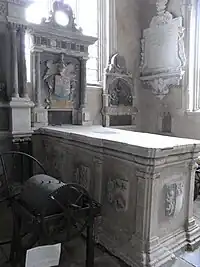 The monument to Katherine Popham (d.1588) stands adjacent to the left (north) of the monument to her husband William Pole (d.1587), and shows her kneeling surrounded by her seven children. Underneath is a tablet with the following inscription in relief:
