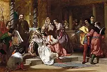 In the early 17th century, Shakespeare wrote the so-called "problem plays" Measure for Measure, Troilus and Cressida, and All's Well That Ends Well and a number of his best known tragedies.[135][136] Many critics believe that Shakespeare's greatest tragedies represent the peak of his art. The titular hero of one of Shakespeare's greatest tragedies, Hamlet, has probably been discussed more than any other Shakespearean character, especially for his famous soliloquy which begins "To be or not to be; that is the question".[137] Unlike the introverted Hamlet, whose fatal flaw is hesitation, the heroes of the tragedies that followed, Othello and King Lear, are undone by hasty errors of judgement.[138] The plots of Shakespeare's tragedies often hinge on such fatal errors or flaws, which overturn order and destroy the hero and those he loves.[139] In Othello, the villain Iago stokes Othello's sexual jealousy to the point where he murders the innocent wife who loves him.[140][141] In King Lear, the old king commits the tragic error of giving up his powers, initiating the events which lead to the torture and blinding of the Earl of Gloucester and the murder of Lear's youngest daughter Cordelia. According to the critic Frank Kermode, "the play...offers neither its good characters nor its audience any relief from its cruelty".[142][143][144] In Macbeth, the shortest and most compressed of Shakespeare's tragedies,[145] uncontrollable ambition incites Macbeth and his wife, Lady Macbeth, to murder the rightful king and usurp the throne until their own guilt destroys them in turn.[146] In this play, Shakespeare adds a supernatural element to the tragic structure. His last major tragedies, Antony and Cleopatra and Coriolanus, contain some of Shakespeare's finest poetry and were considered his most successful tragedies by the poet and critic T. S. Eliot.[147][148][149]