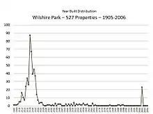 The first recorded residence in Wilshire Park was built in 1908. The transitional Prairie School style home (right) is an example of the work of architect Lloyd Wright. The neighborhood also features a 1938 apartment complex by the only female architect in Los Angeles at the time, by Edith Mortensen Northman.[7] Most of Wilshire Park was fully built out by 1926. The graph shows the pattern of development.